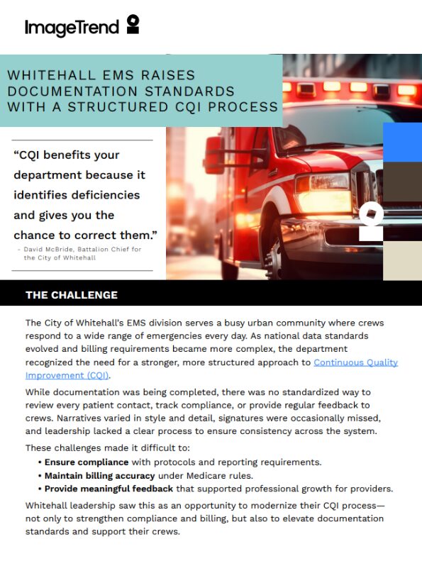 The City of Whitehall’s EMS division serves a busy urban community where crews respond to a wide range of emergencies every day. As national data standards evolved and billing requirements became more complex, the department recognized the need for a stronger, more structured approach to Continuous Quality Improvement (CQI).