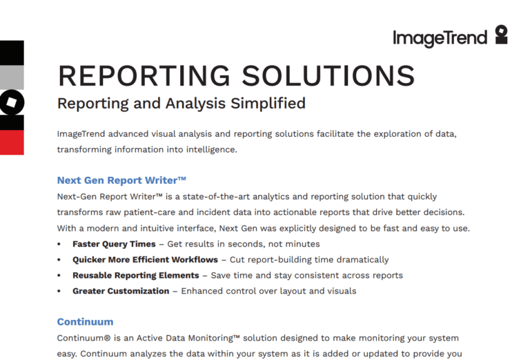 ImageTrend’s advanced visual analysis and reporting solutions enable the exploration of data, transforming information into intelligence.