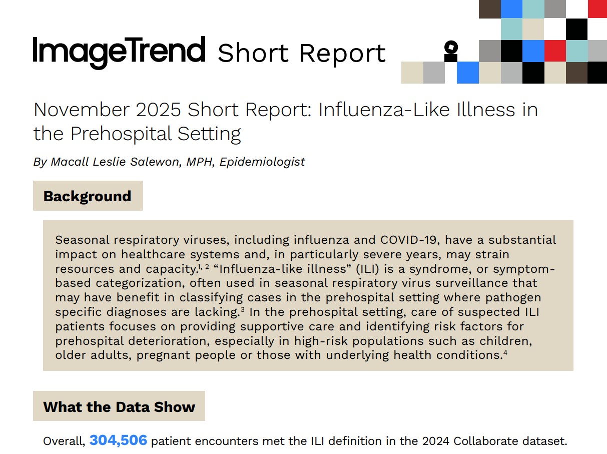 Seasonal respiratory viruses put steady pressure on EMS every fall and winter. This month’s report analyzes nationwide 9-1-1 encounters that met the Influenza-Like Illness (ILI) case definition in the ImageTrend Collaborate dataset, showing how ILI presents in the field and where preparedness can reduce strain.
