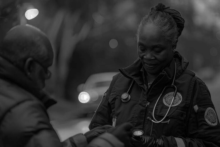 Two individuals outdoors, one with a stethoscope around their neck. The scene is in grayscale, and both wear jackets.